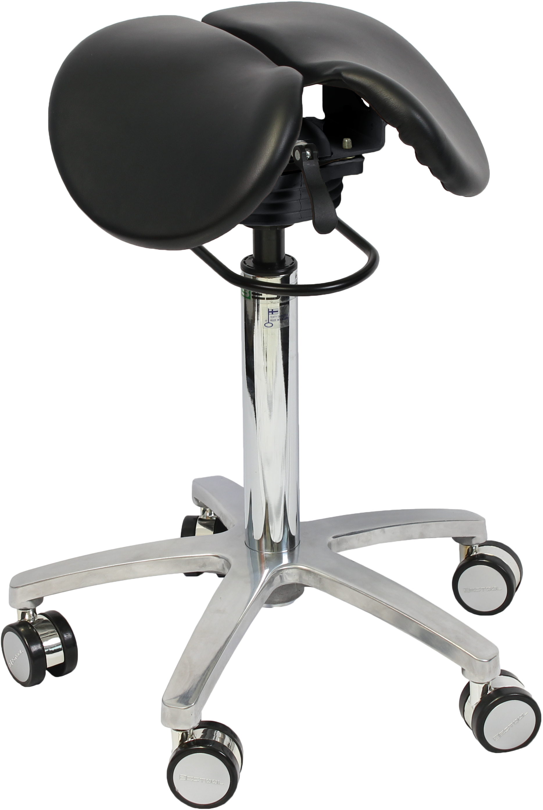 Liikkeitä myötäilevä, kaksiosainen, säädettävä ja patentoitu satulatuoli.
