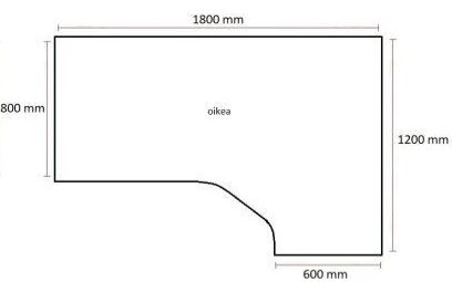 Pöytälevyn koko 1800(800) x 1200(600) mm oikeakätinen, paksuus 25 mm.