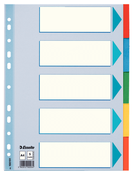 Hakemistoreksiteri värikkäänä väriyhdistelmänä. Valmistettu kierrätetystä kartongista. Materiaali Blue Angel sertifioitu. Etusivulla paljon tilaa sisällön kuvaukselle.