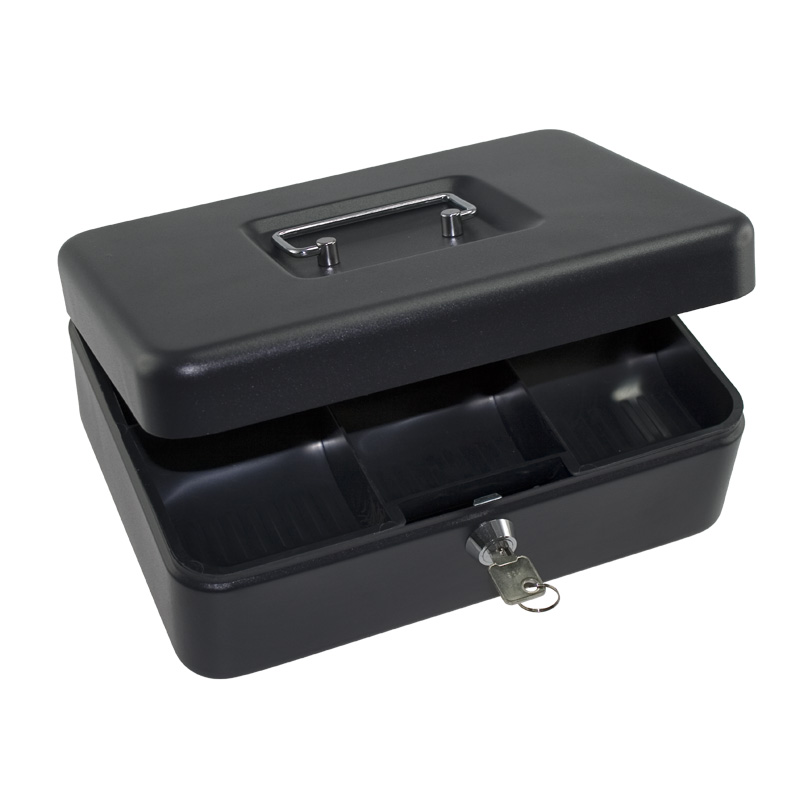 Valettu metallilevy, jossa on kantokahva, sisärasia muovia jossa 6 kolikkotaskua. Sylinterilukko, mukana kaksi avainta. 300x240x90mm musta