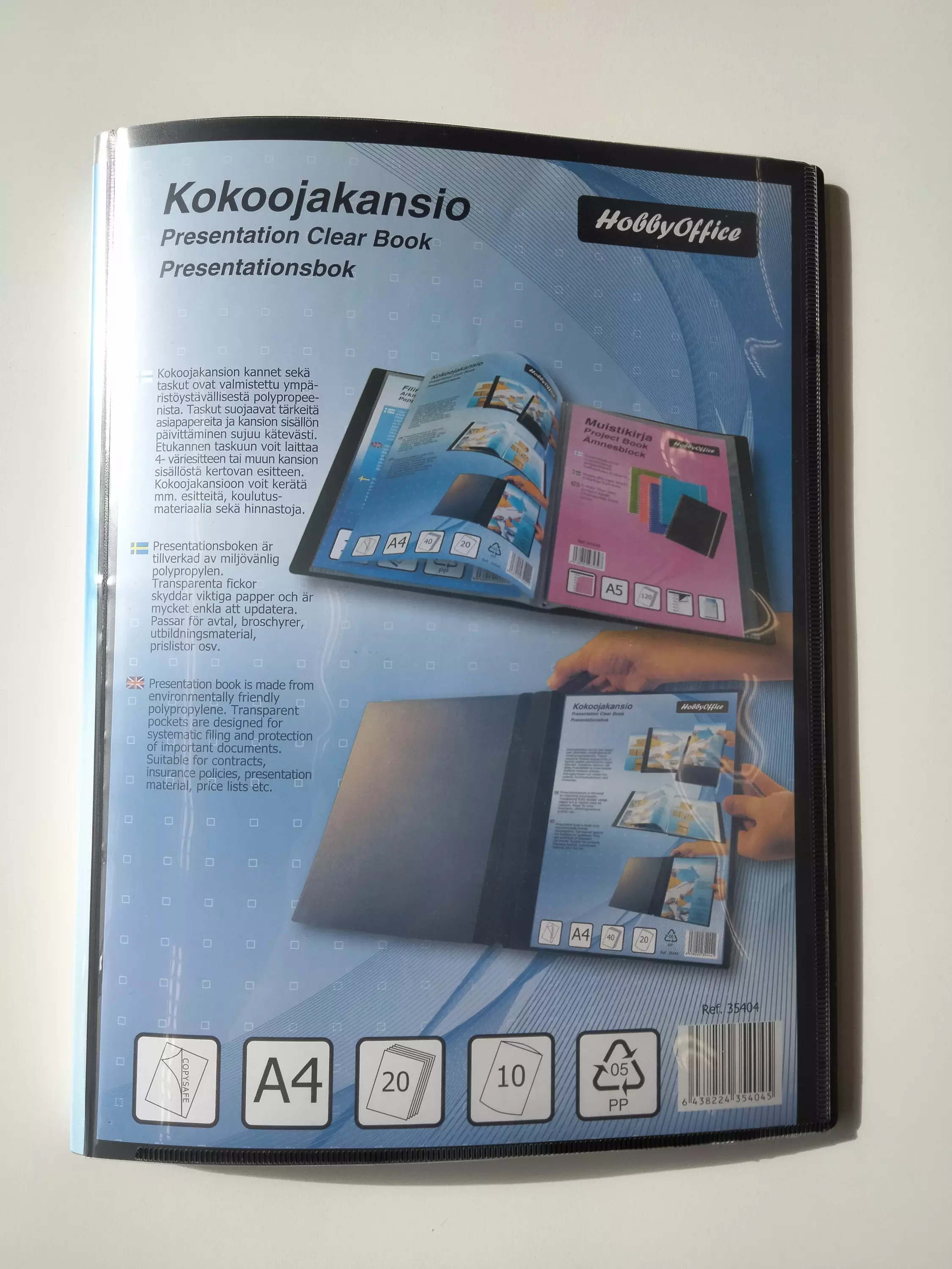Muovitasku etukannessa. Sisällä 10, kirkasta muovitaskua. Väri musta.