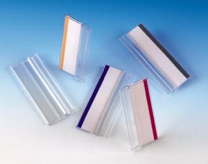 Pussissa mukana 10 otsakekilpeä ja värikoodattua kartonkiliuskaa (toinen puoli valkoinen). Leveys 50 mm.