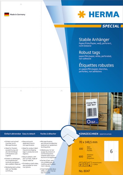 Herma etiketti 70 x 148,5 mm, 6-os, valkoinen, rei'itetty, ei-tarttuva, tulostettava