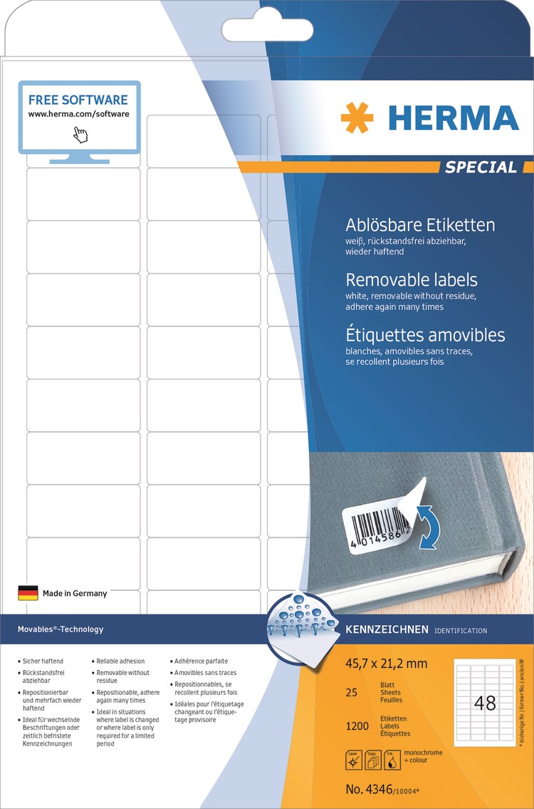 Herma Label Removable 45,7 x 21,2mm, 48-osainen valkoinen.