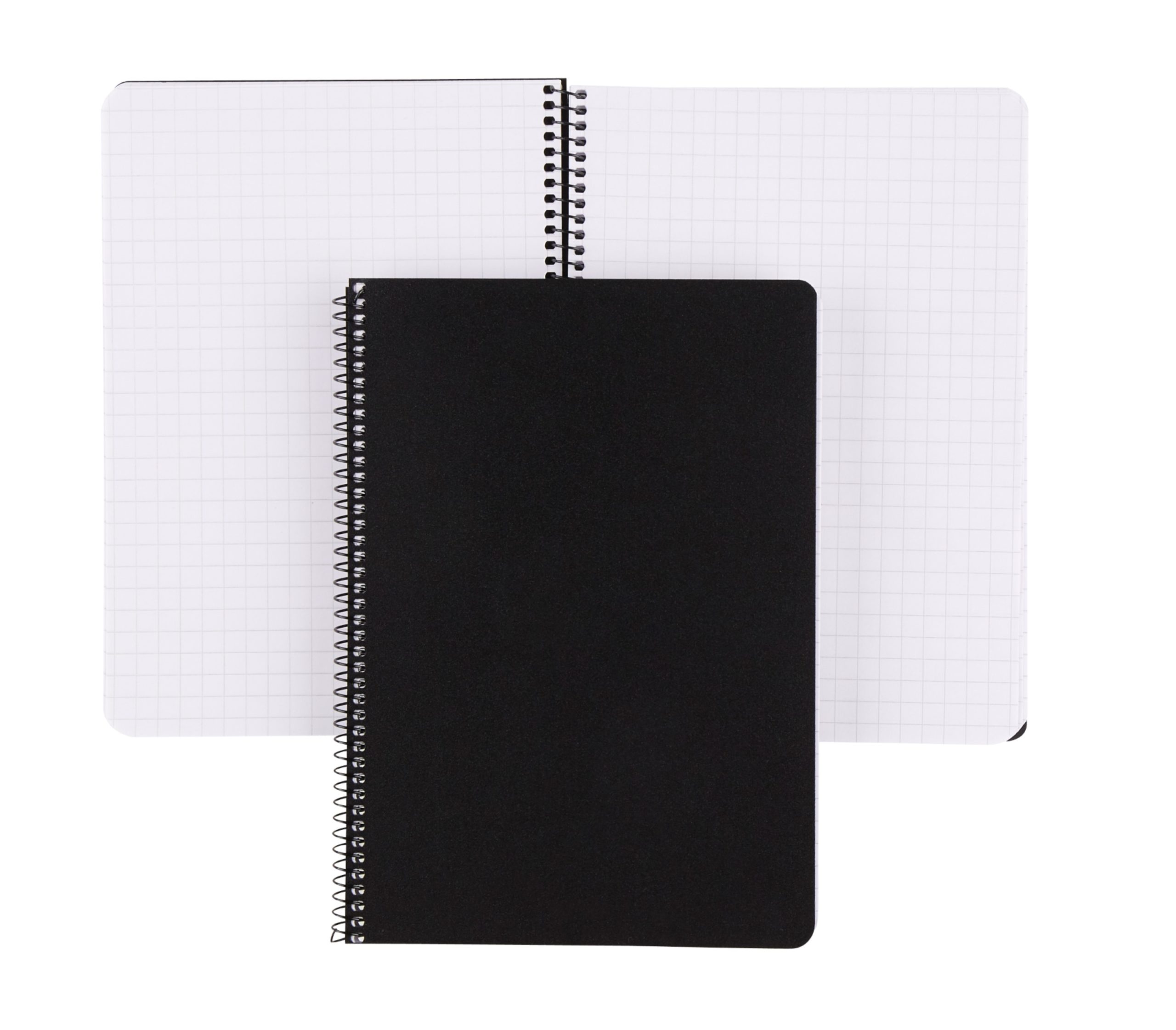 Kotimainen muovikantinen kierrevihko A5/80. Kestävät 0,8 mm polypropeenikannet.