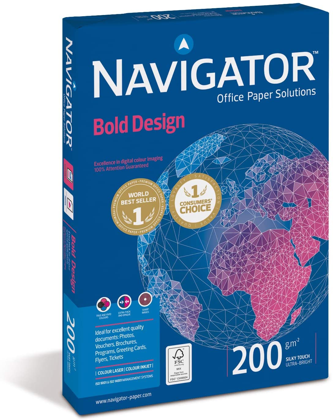 Navigator Bold Design A4/200g on tukeva ja sileäpintainen paperi laadukkaaseen digitaaliseen tulostukseen.
