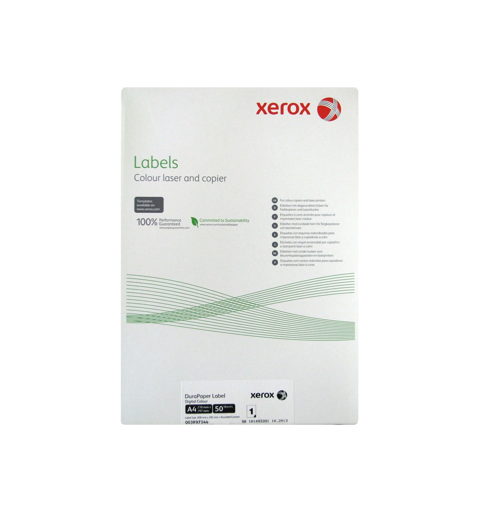 Xerox Dura Label A4 228 g/m². Median paino: 228 g/m², Läpinäkymättömyys: 97%. Materiaaliarkkien määrä pakkauksessa: 50 arkkia, Materiaalin koko (1 dia): A4, Valkoisuus: 83 CIE