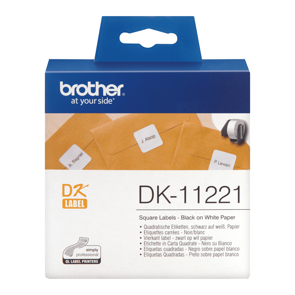 Brotherin alkuperäinen DK11221 on valmiiksi muotoiltu neliötarra, jonka pohjaväri on valkoinen ja tekstiväri musta.