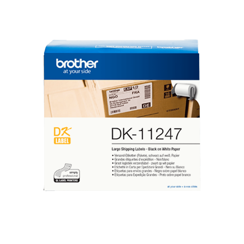 Brotherin jatkuva valmiiksi muotoiltu DK11247 rullatarra valkoisella pohjalla ja mustalla tekstillä on hyvä valinta yleiseen tarramerkintään.