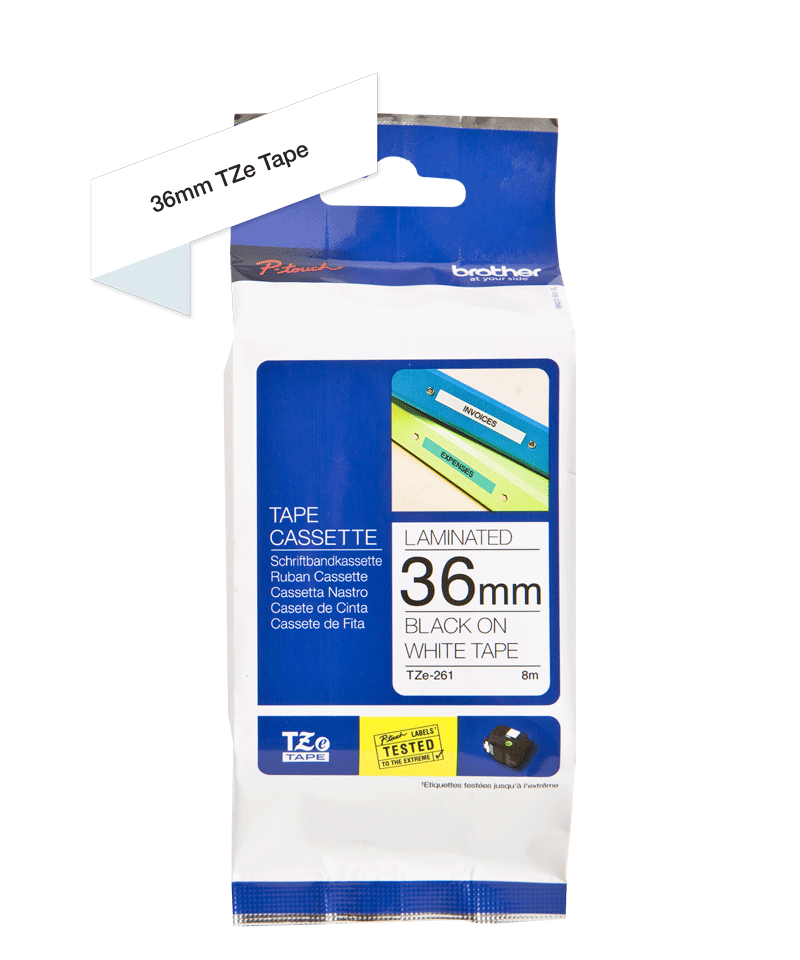 Korkealaatuinen Brother-tarranauha. Kestävään ja selkeään merkintään. Musta teksti valkoisella pohjalla. Leveys 36 mm, pituus 8 m