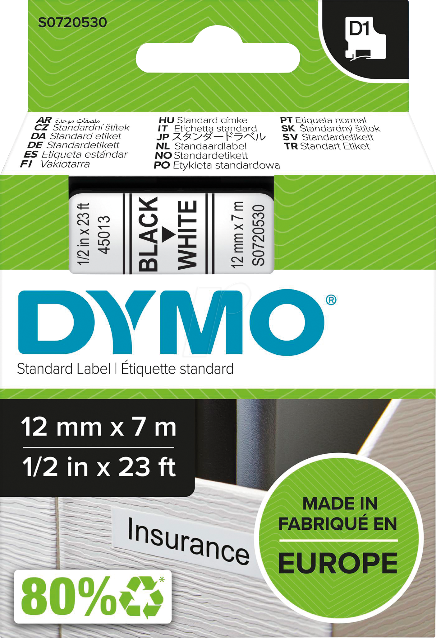 Dymo D1 tarranauha, nauhan leveys 12mm, pituus 7m, musta teksti valkoisella tarranauhalla. Itsekiinnittyvä D1-teippi tarttuu lähes kaikkiin puhtaisiin ja tasaisiin pintoihin esim. muoviin, paperiin... Lue lisää