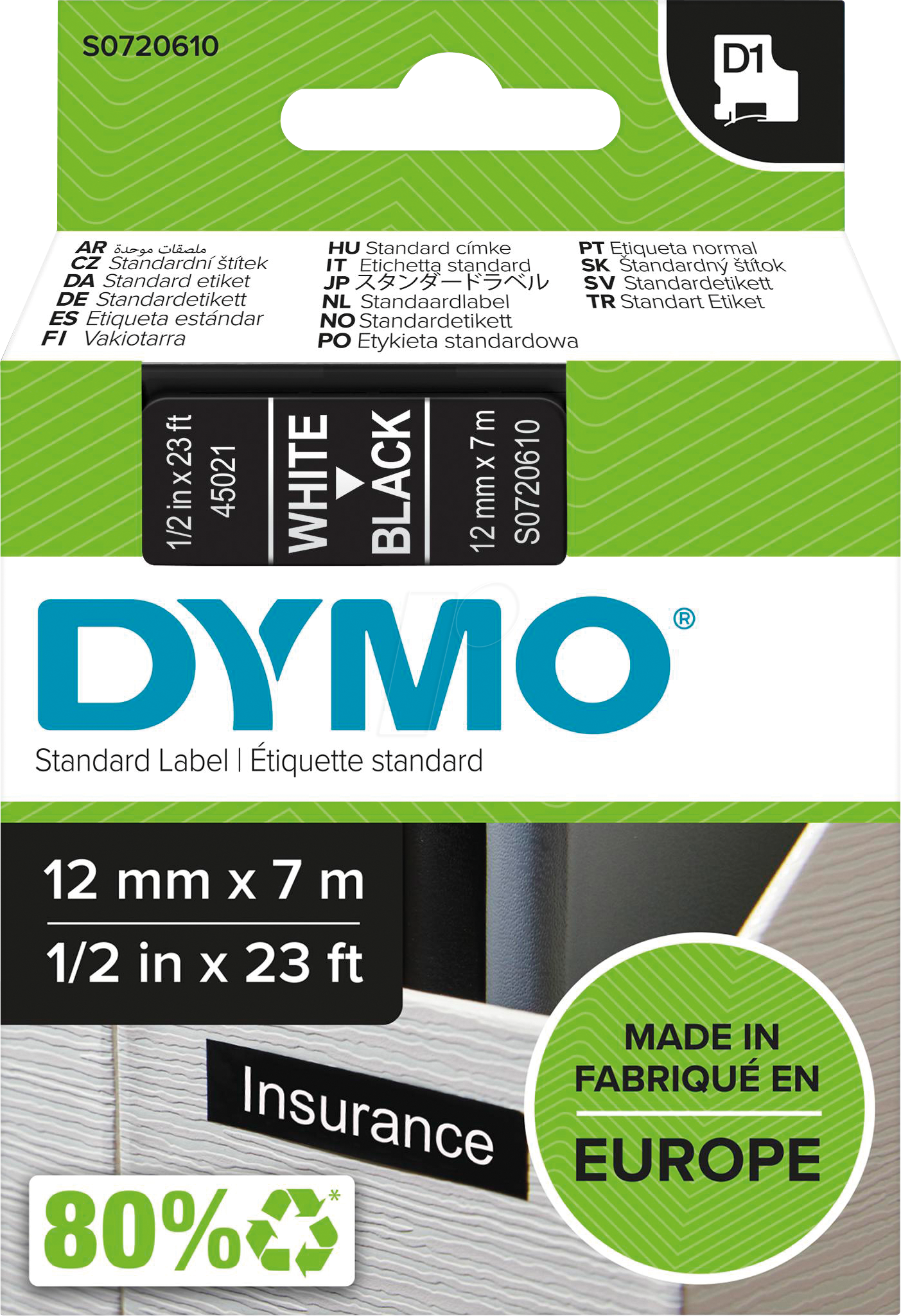 Dymo D1 tarranauha, nauhan leveys 12mm, pituus 7m, valkoinen teksti mustalla tarranauhalla.