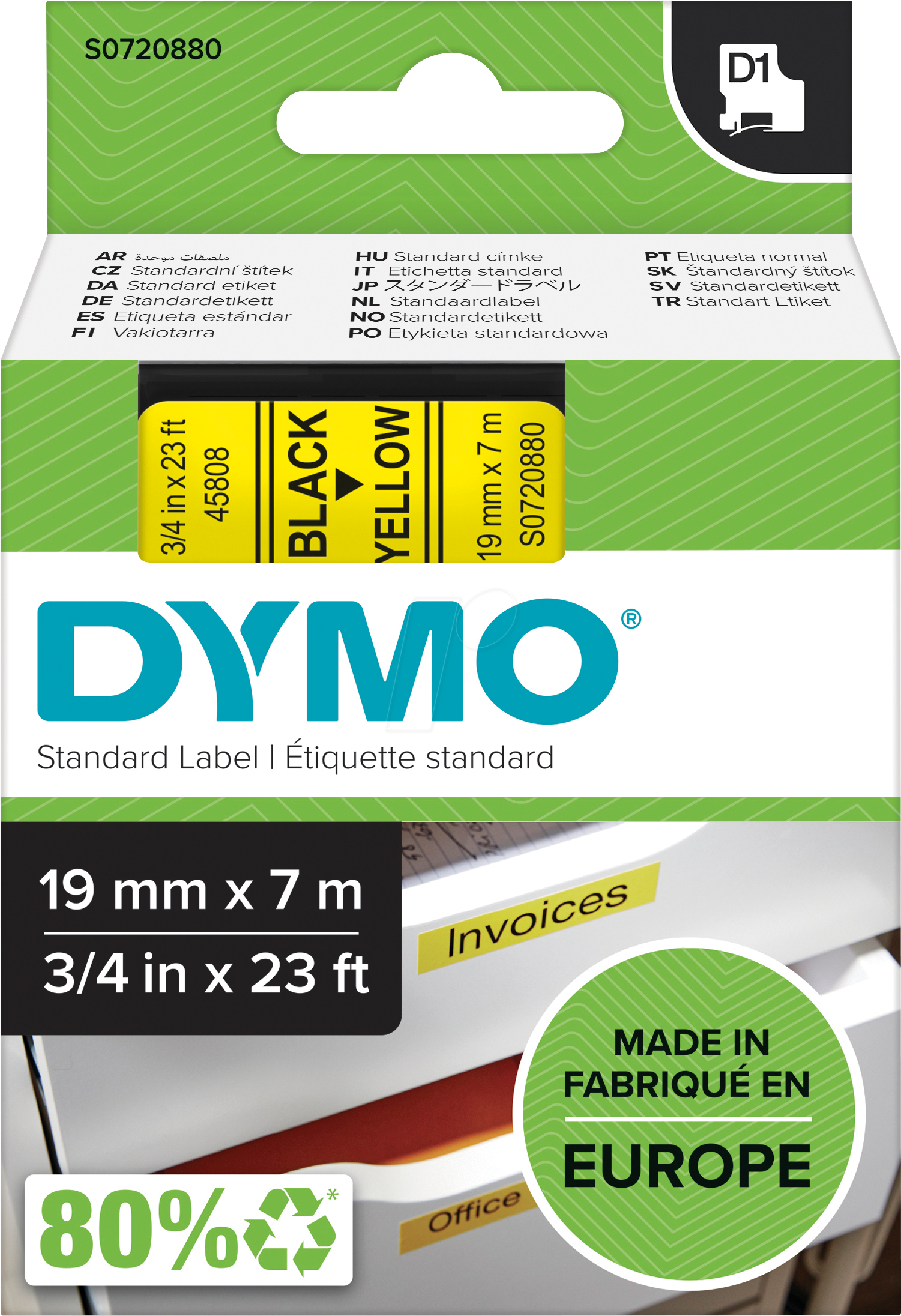 Dymo D1 tarranauha, nauhan leveys 19mm, pituus 7m, musta teksti keltaisella tarranauhalla.
