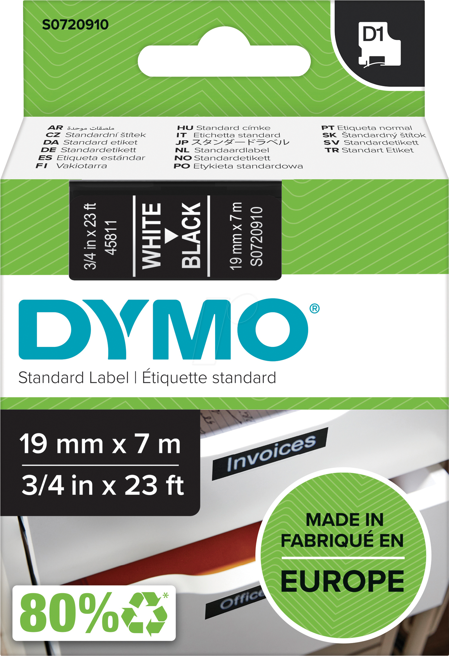 Dymo D1 tarranauha, nauhan leveys 19mm, pituus 7m, valkoinen teksti mustalla tarranauhalla.