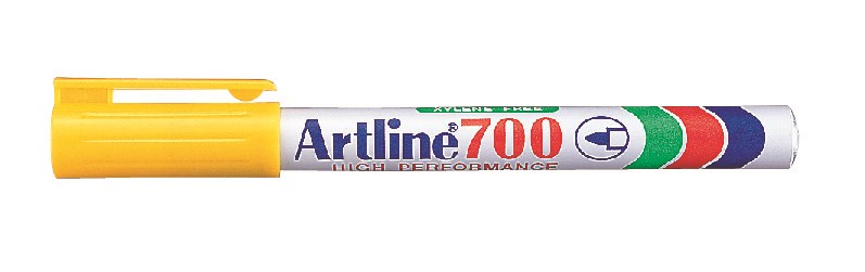 Pysyvä huopakynä 0,7 mm pyöreällä kärjellä. Nopeasti kuivuva, vedenpitävä, alumiinirunko, täytettävä, alkoholipohjainen pysyvä tussi ilman ksyleeniä. Väri: keltainen.