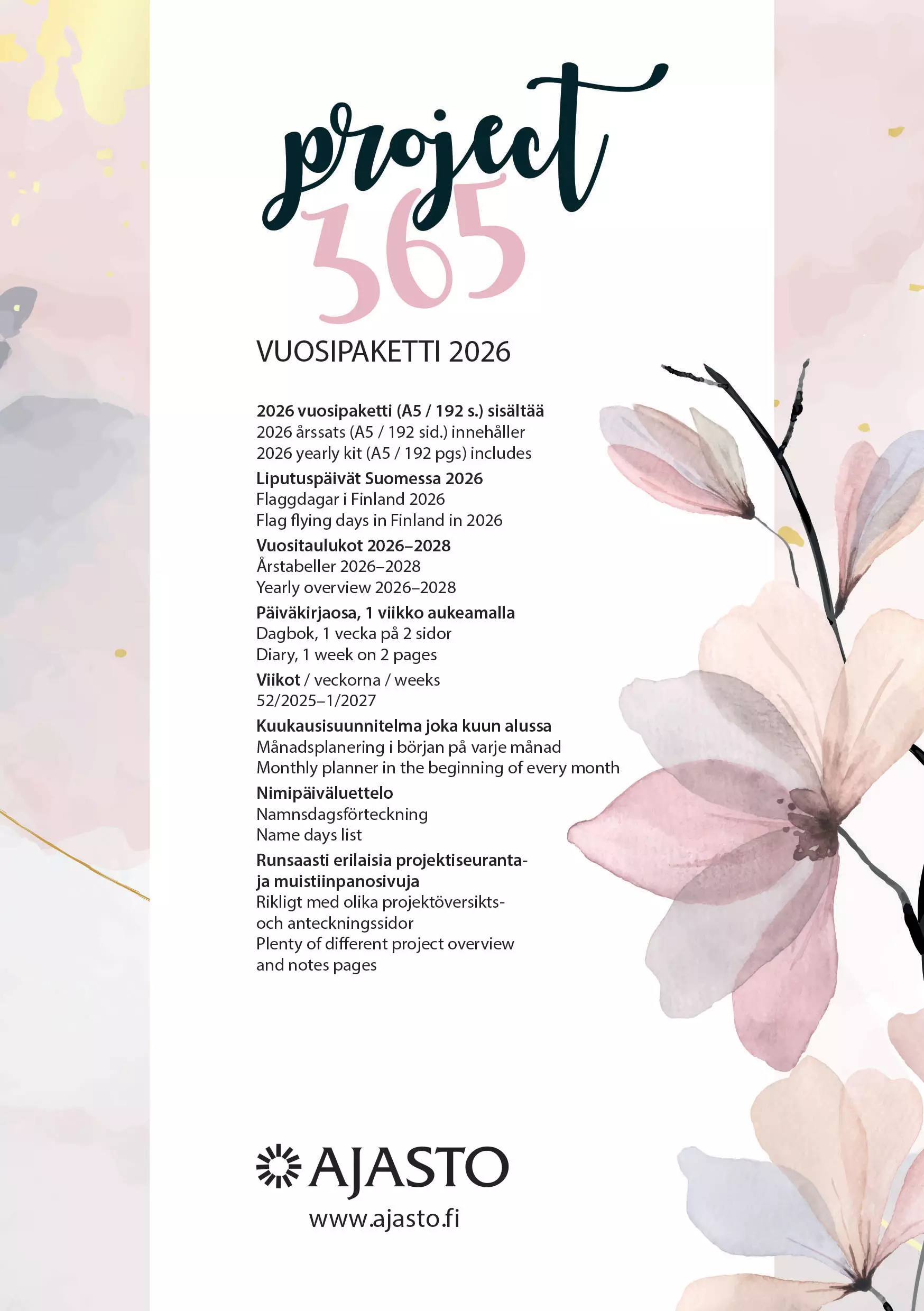 Project365-vuosipaketti; sopii myös Timex Space -kansiin. Koko 148 x 210 mm (A5) kielisyys: suomi, ruotsi, englanti aukeamalla viikkonäkymä kuukausisuunnitelma kunkin kuukauden alussa päiväkirja... Lue lisää