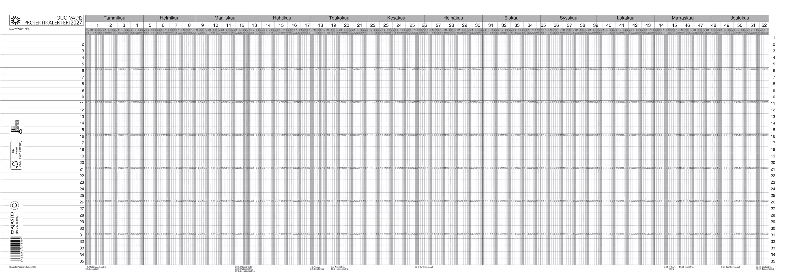Quo Vadis -projektikalenteri 2027. Koko 837 x 297 mm, taitettuna A4 suunnittelukalenteri, jossa koko vuosi kerralla nähtävissä kuukaudet rinnakkain, myös viikko- ja päiväjaotus tehtäville ja... Lue lisää