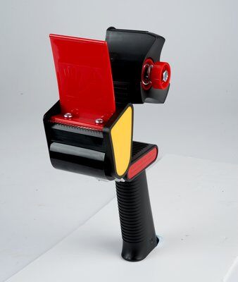 Tässä pakkausteipin katkaisulaitteessa on pistoolikahva, joka mahdollistaa laitteen helpon käytön.