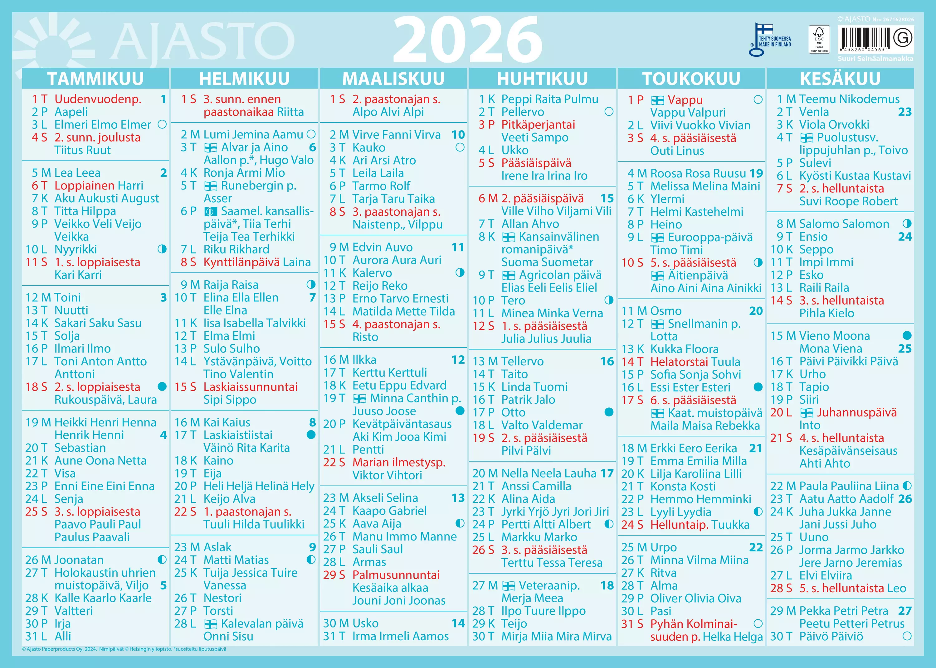 Koko 490 x 350 mm kirkkopyhät ja juhlapäivät runsaasti nimipäiviä tukevaa kartonkia Avainlippu-tuote FSC®-sertifioitu tuote.