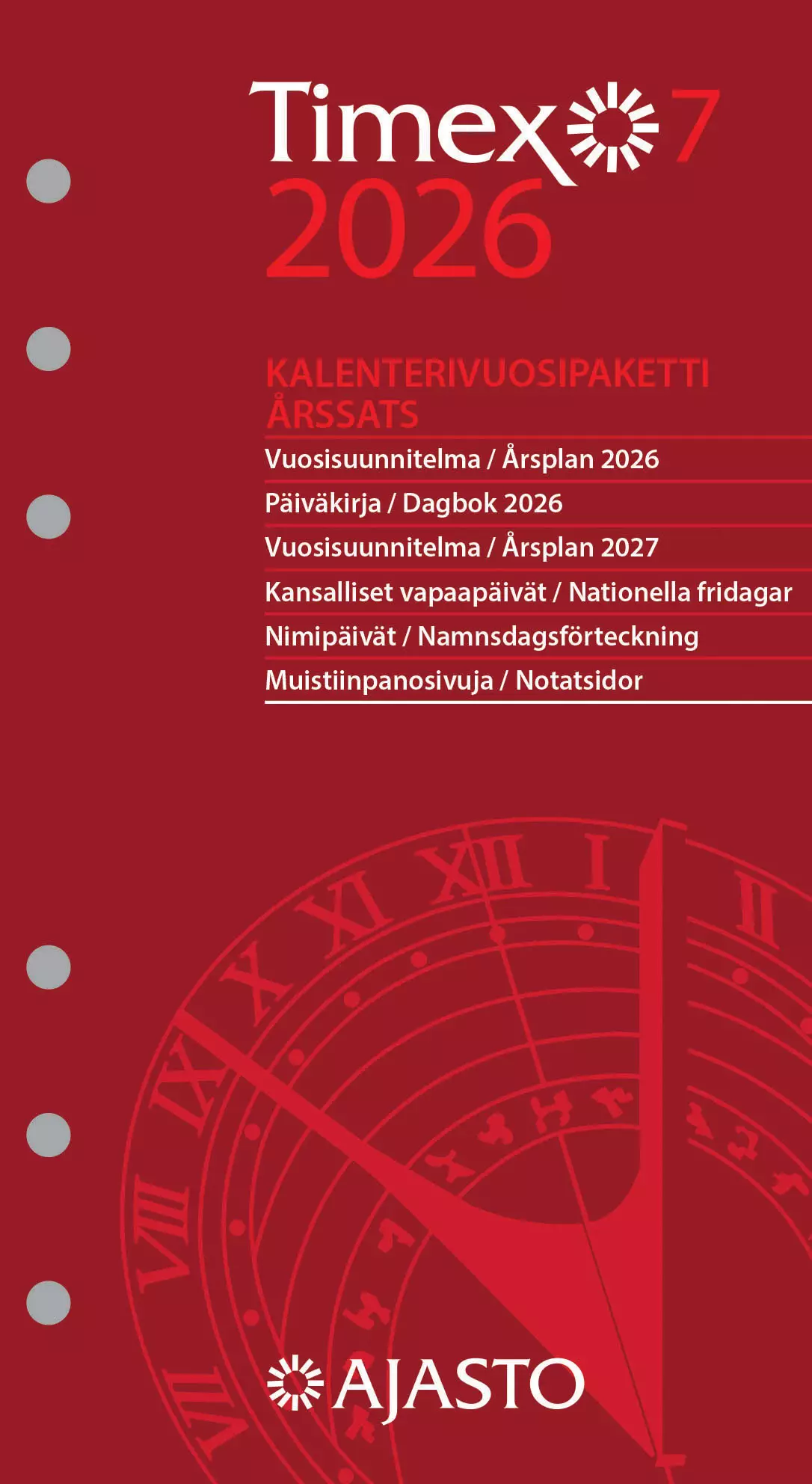 Timex 7 -vuosipaketti. Koko 92 x 168 mm kielisyys: suomi, ruotsi aukeamalla pystyviikko päiväkirja 52/2025–1/2027 vuosisuunnitelmat 2026 ja 2027 suomalaiset ja suomenruotsalaiset nimipäivät... Lue lisää