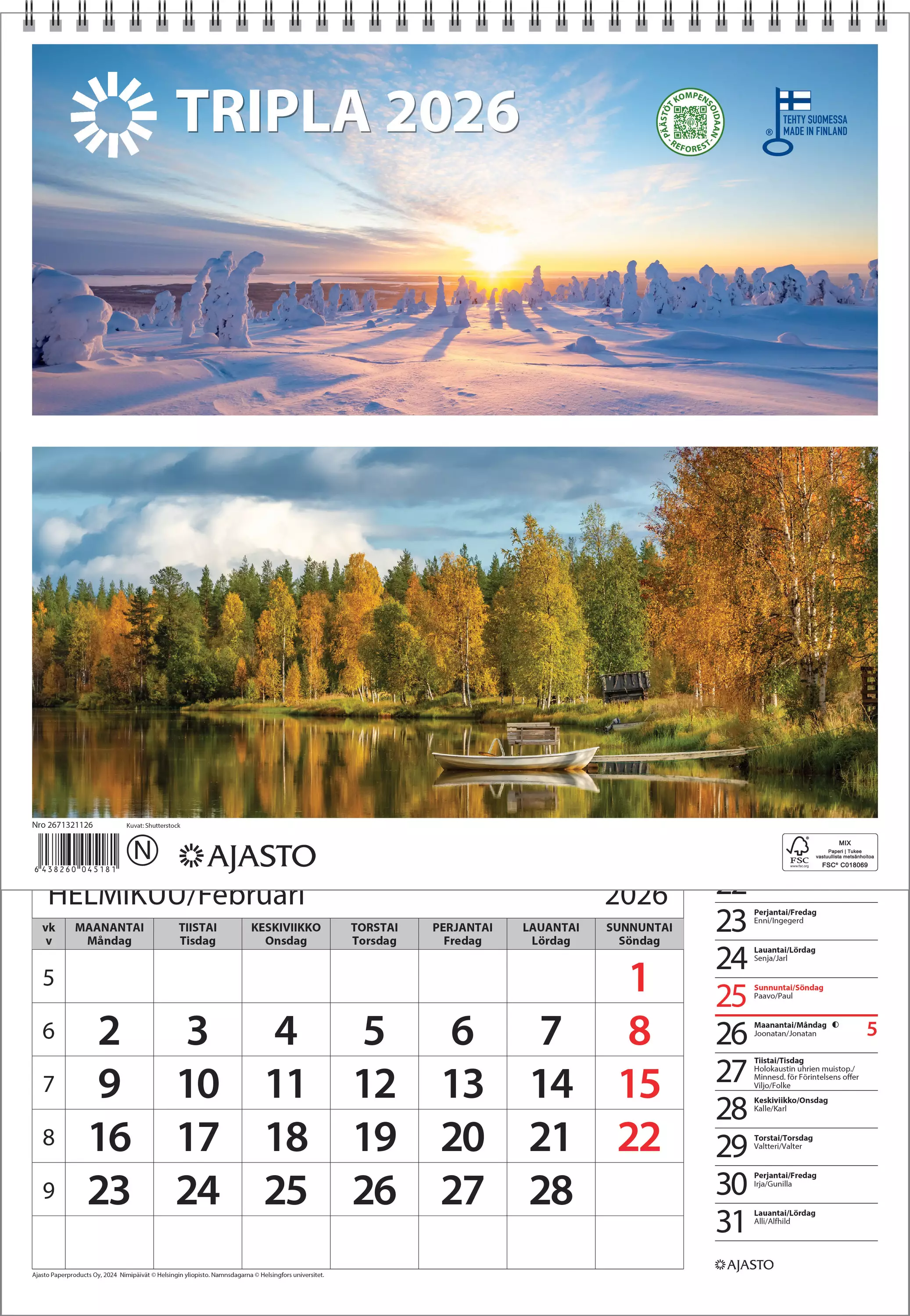 Tripla. Koko 290 x 415 mm, avattuna 290 x 695 mm parikierresidottu kielisyys: suomi, ruotsi suomalaiset ja suomenruotsalaiset nimi- ja juhlapäivät kannessa värikuva ja koko vuoden taulukkokalenteri... Lue lisää