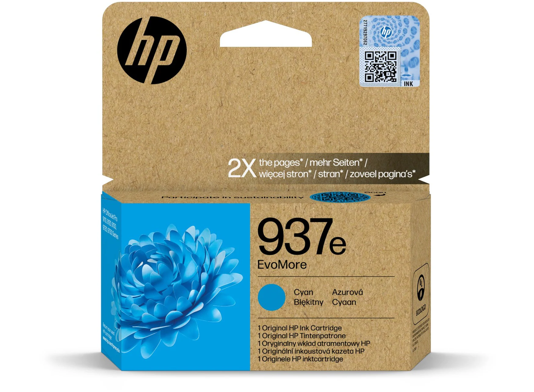 Alkuperäinen HP mustekasetti 937e EvoMore Cyan.