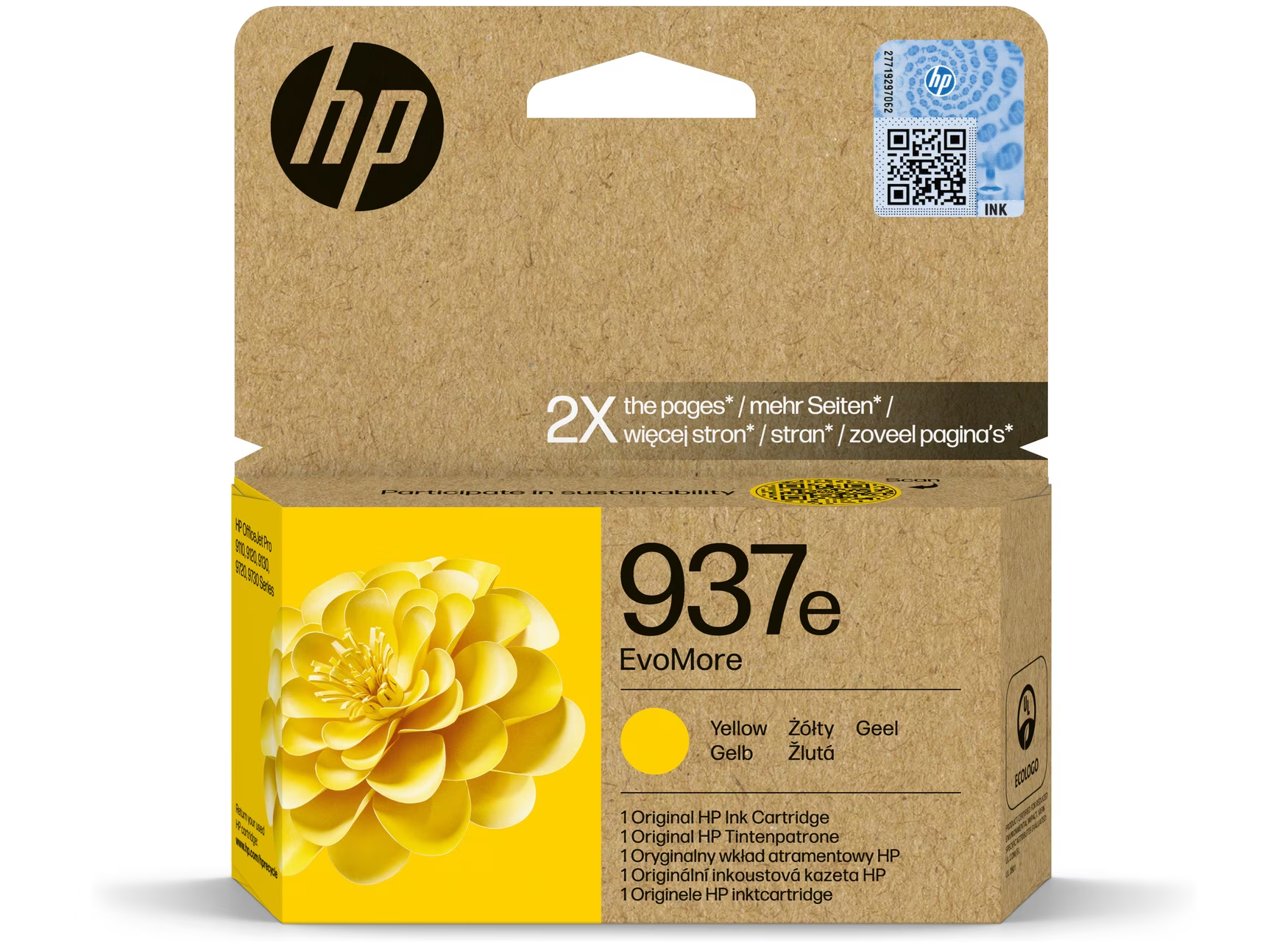 Alkuperäinen HP mustekasetti 937e EvoMore Yellow.