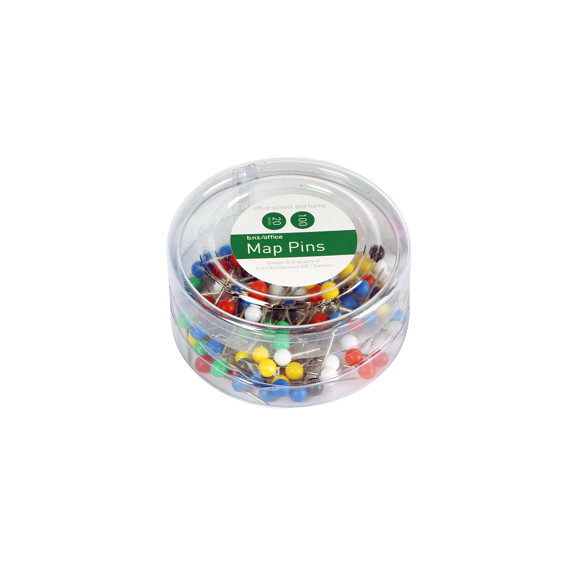 Karttaneulat pyöreällä 4 mm:n päällä. Pituus 20 mm. Rasiassa 100 neulaa.